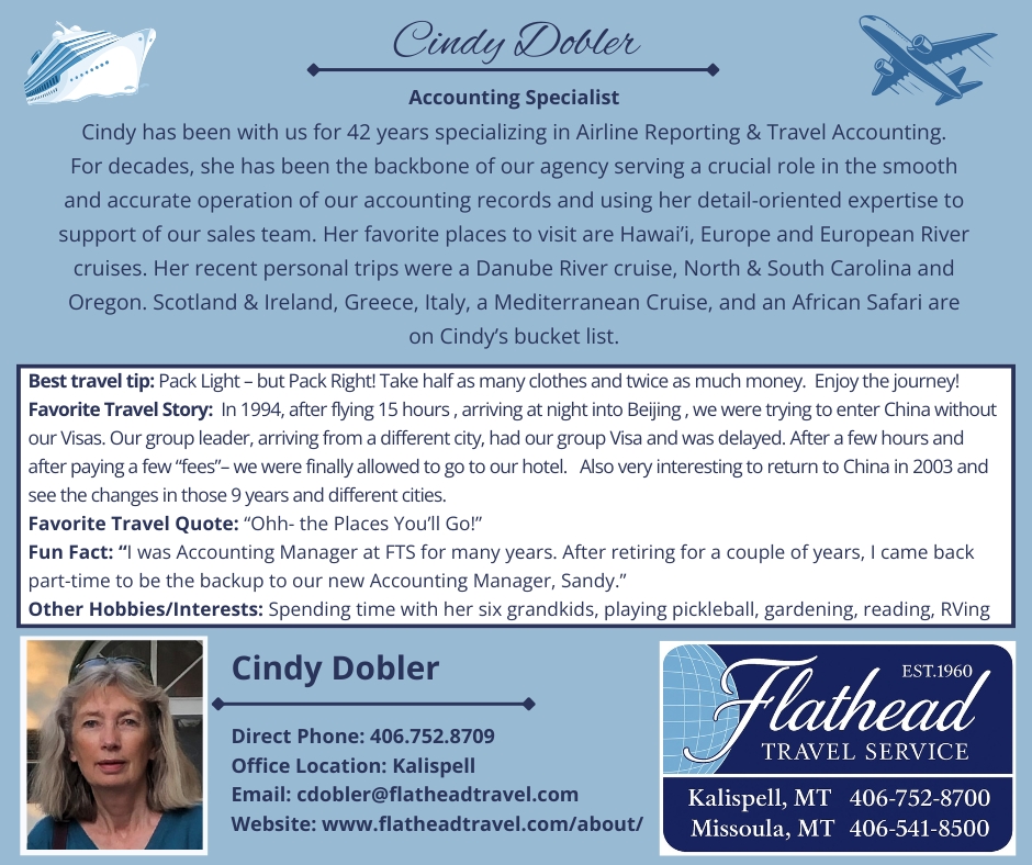 Agency Buzz Flathead Travel AdvisorMeet Cindy! Ready to Travel? Customized Itineraries Stress-free Travel Exclusive Deals 24/7 Support Let's Plan Together406-752-8700