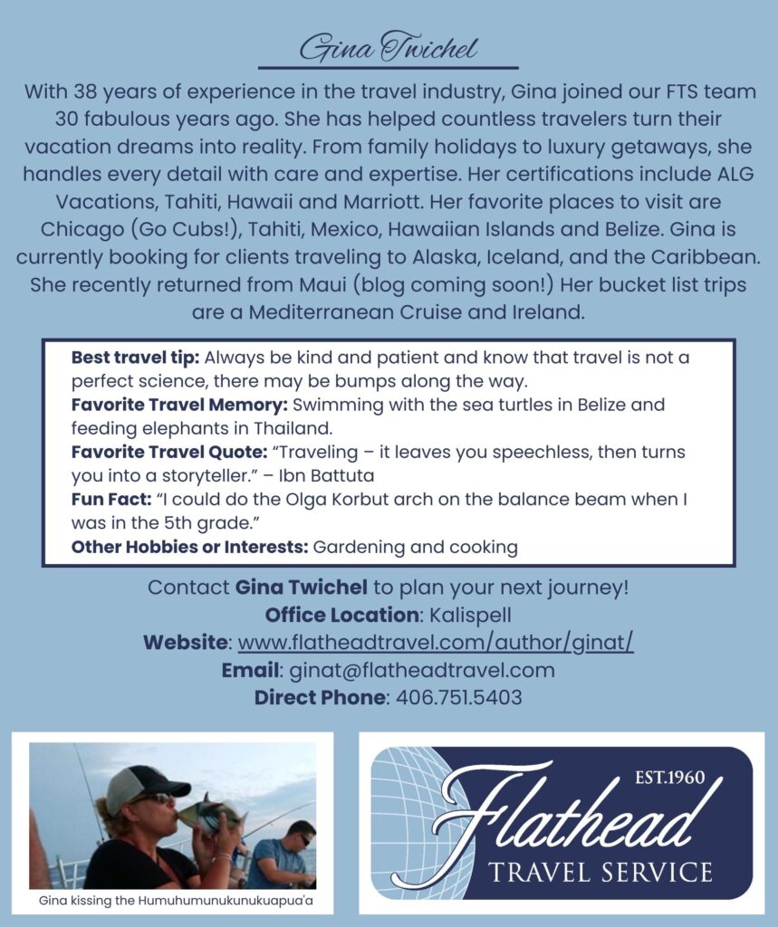 Agency Buzz Flathead Travel AdvisorMeet Gina! Ready to Travel? Customized Itineraries Stress-free Travel Exclusive Deals 24/7 Support Let's Plan Together406-752-8700