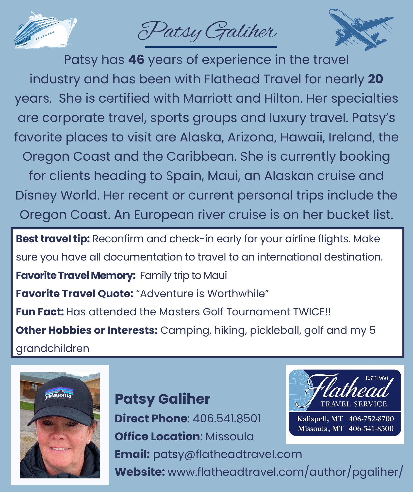 Agency Buzz Flathead Travel AdvisorMeet Patsy! Ready to Travel? Customized Itineraries Stress-free Travel Exclusive Deals 24/7 Support Let's Plan Together406-752-8700